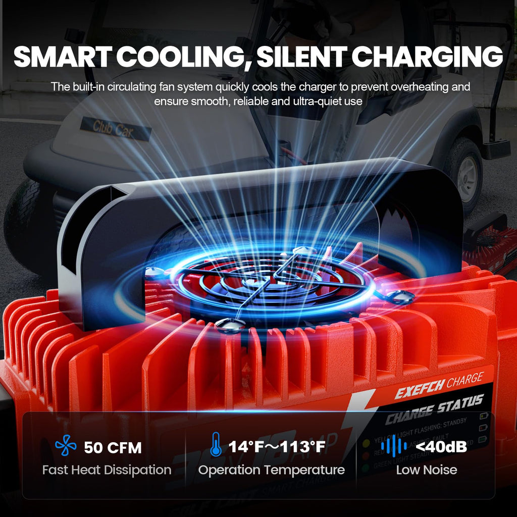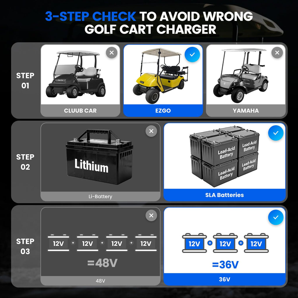 - [Universal OBC/Non-OBC Compatibility]: A true smart golf cart charger. Works seamlessly with or without an Onboard Computer (OBC), offering plug-and-play convenience for all EZGO TXT golf carts needs. It features intelligent auto-matching technology that seamlessly syncs with your vehicle's On-Board Charger (OBC), requiring no modifications or adapters