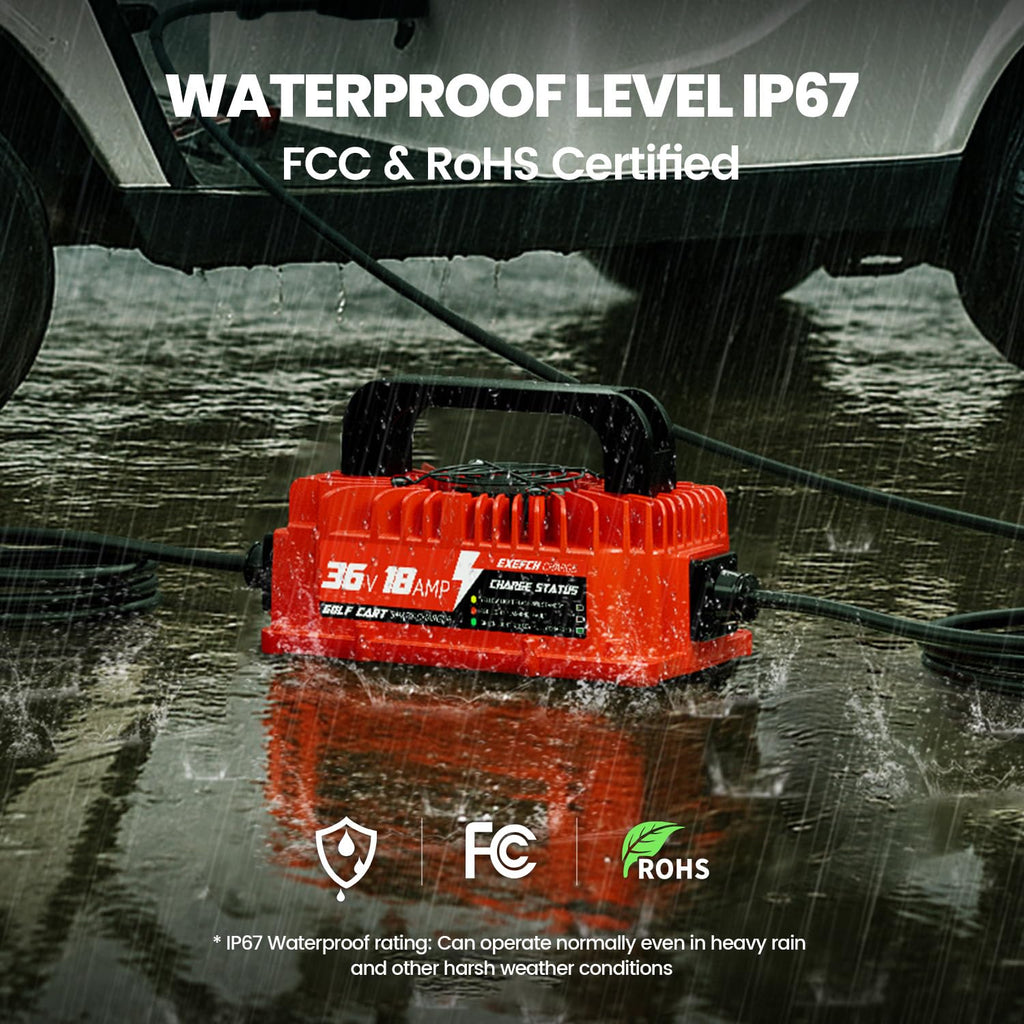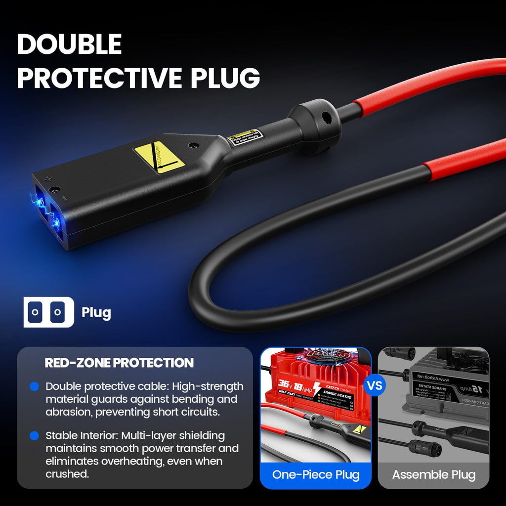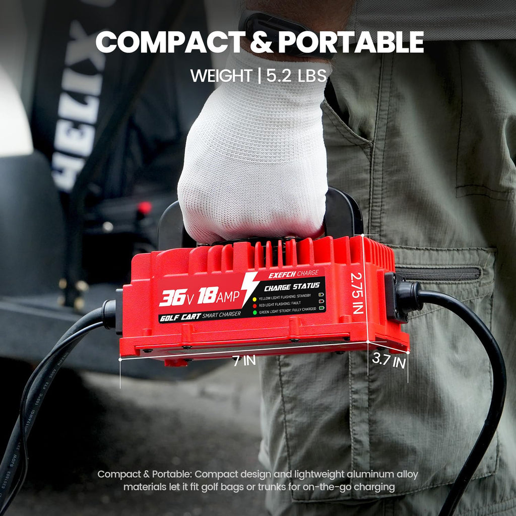 - [Fast 7-Hour Charging]: High-efficiency 36v 18amp 900W golf cart battery charger delivers a full charge for EZGO TXT golf carts SLA battery in just 7 hours. Features auto shut-off and built-in over-voltage/over-current protection to extend battery life. Not applicable to li-ion batteries