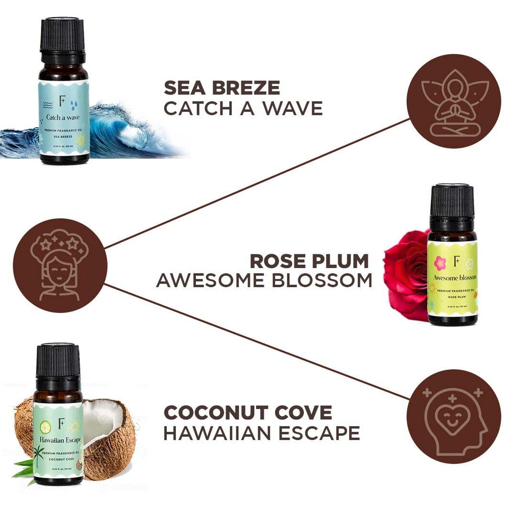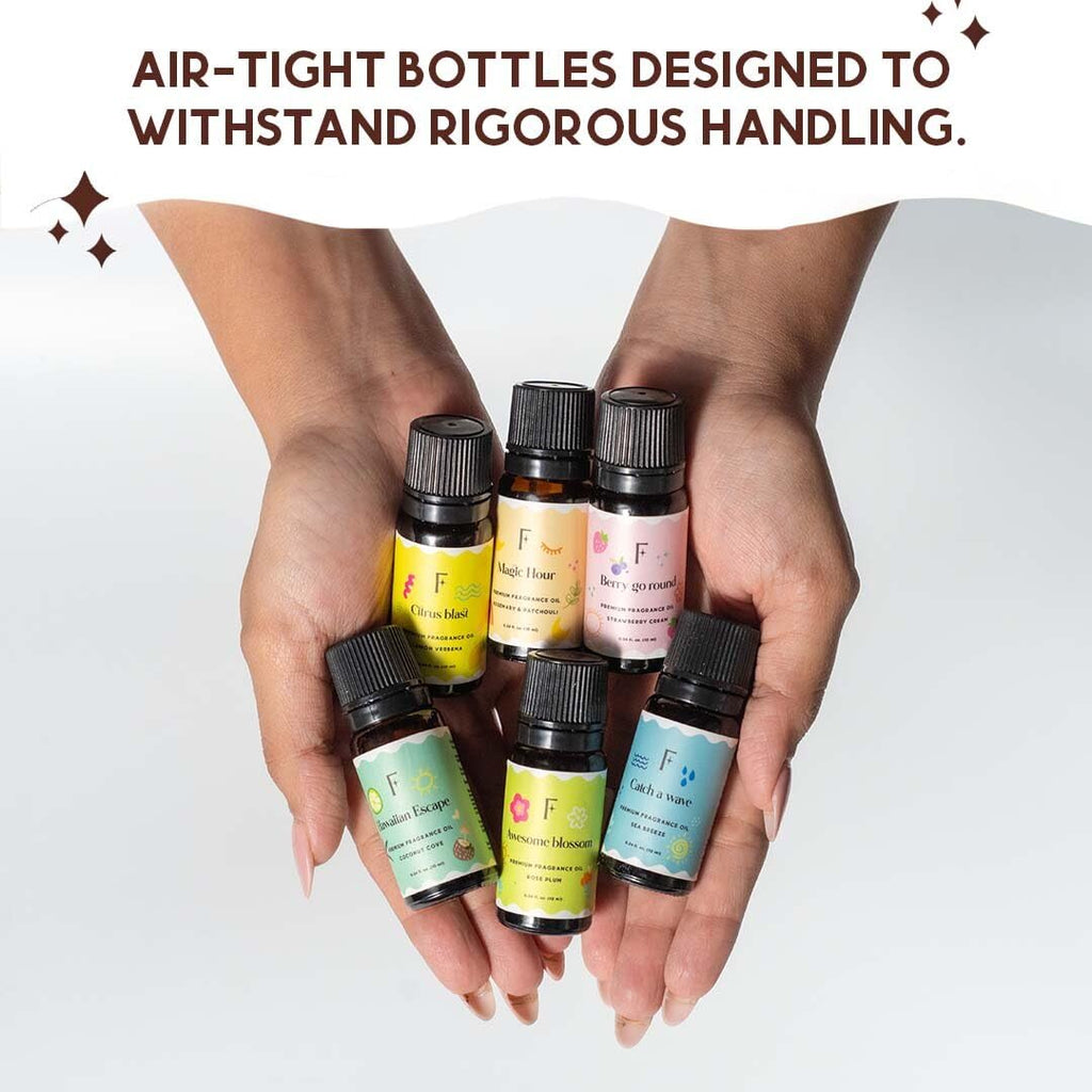 • Curated Set of 6 Fruity Diffuser Oils : Includes Coconut, Strawberry, Lemon, and complementary herbal blends. Each fragrance is carefully balanced to deliver a smooth, long-lasting aroma that refreshes living spaces without overpowering.