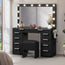 Details: Create your personal beauty corner in any dressing room with this chic vanity. Featuring a sturdy engineered wood frame, 12 bright bulbs with 3 lighting modes for ideal detail, plus 10 roomy drawers and a sleek glass top to keep your essentials organized. Built-in outlets and USB ports keep your tools powered while you relax on the soft stool, making your daily routine smooth and enjoyable.Specifications:Material: Engineered Wood Vanity' Size: 15.7"D x 46"W x 55.9"H Chair' Size: 15.8"D x 11.2"W x 17.1"H Net Product Weight: 117.8 lbs Assembly required: yes, instructions included