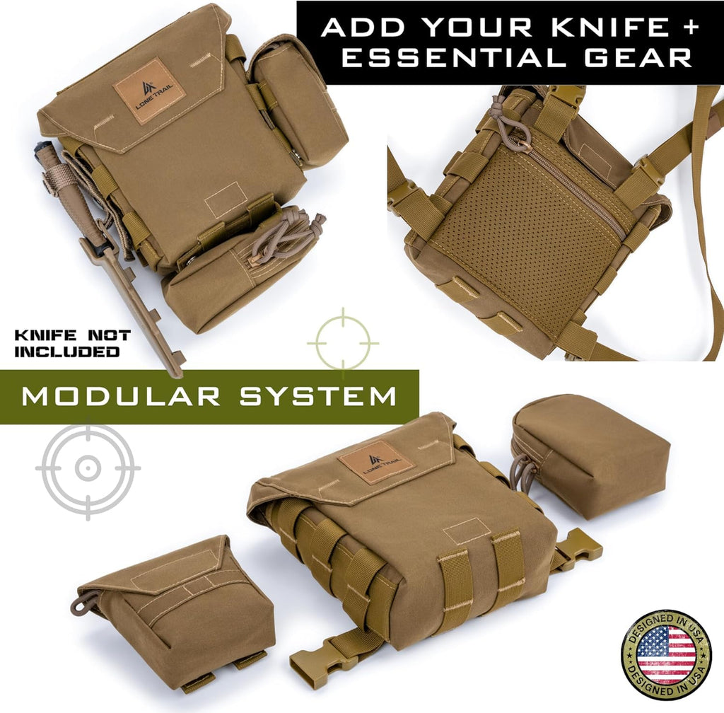 - TOUGH, WEATHER-DEFYING DESIGN: Built with rain resistant 500D Cordura, our binocular chest pack (6" W x 7.1" H) for binoculars and (4.1" H x 3.1" W) for rangefinder pouch protect your gear from rain, dirt, and the harsh conditions of the great outdoors. Ideal for deer hunting kits.