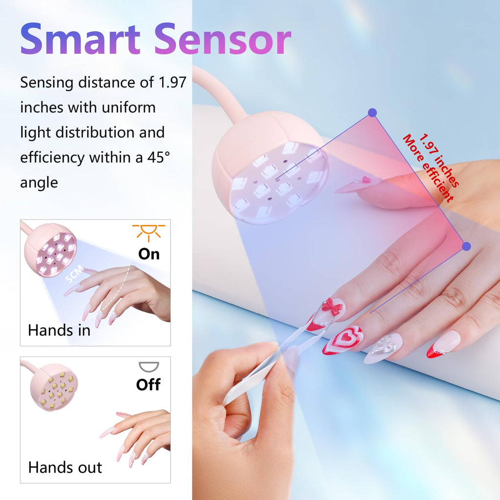 - Smart Sensor with 4 Brightness Setting: The nail cure lamp is equipped with an auto infrared sensor. Hand in, light on; Hand out, light off. Offering 45s (default), 10s, 30s, and 60s timing options displayed on the LCD screen, it adapts to different curing needs for various nail styles. Features touch controls for added convenience.