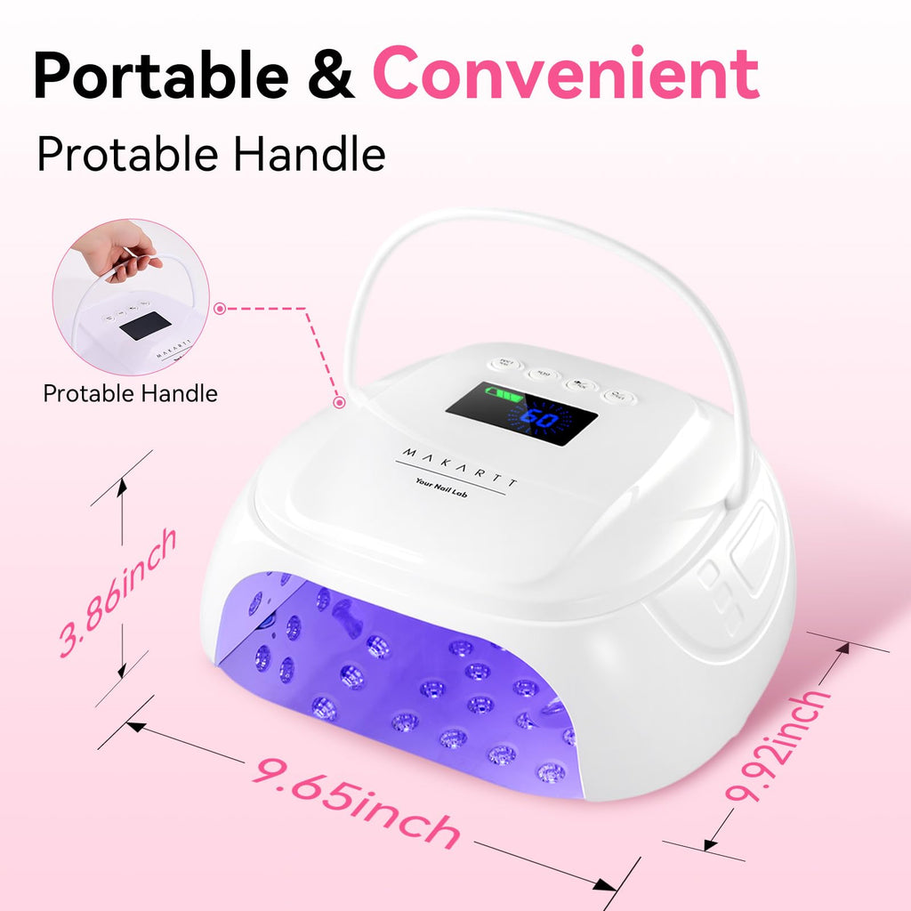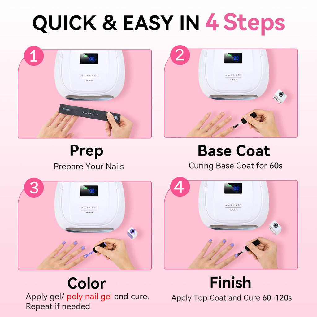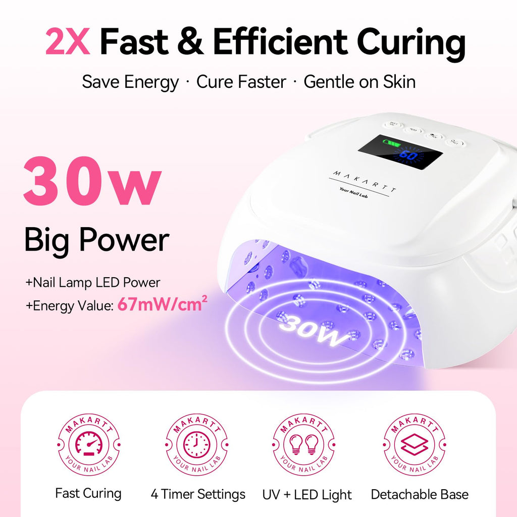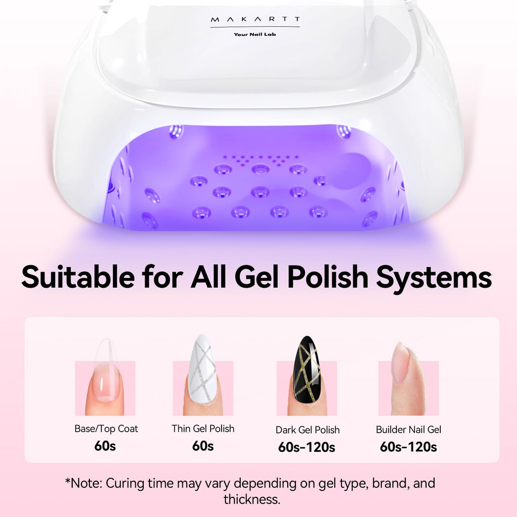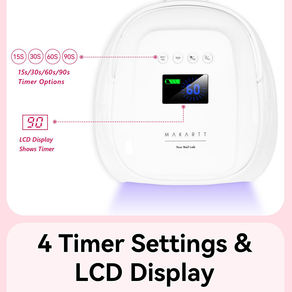 - 4 Timer Settings + Low Heat Comfort Mode: Customize your session with 15s, 30s, 60s, or 90s timer settings. The low heat mode provides a gentle, gradual cure to avoid discomfort—perfect for sensitive nails or thicker gel layers. A great alternative or upgrade from the typical Makartt UV nail lamp or nail lamps for gel polish.
