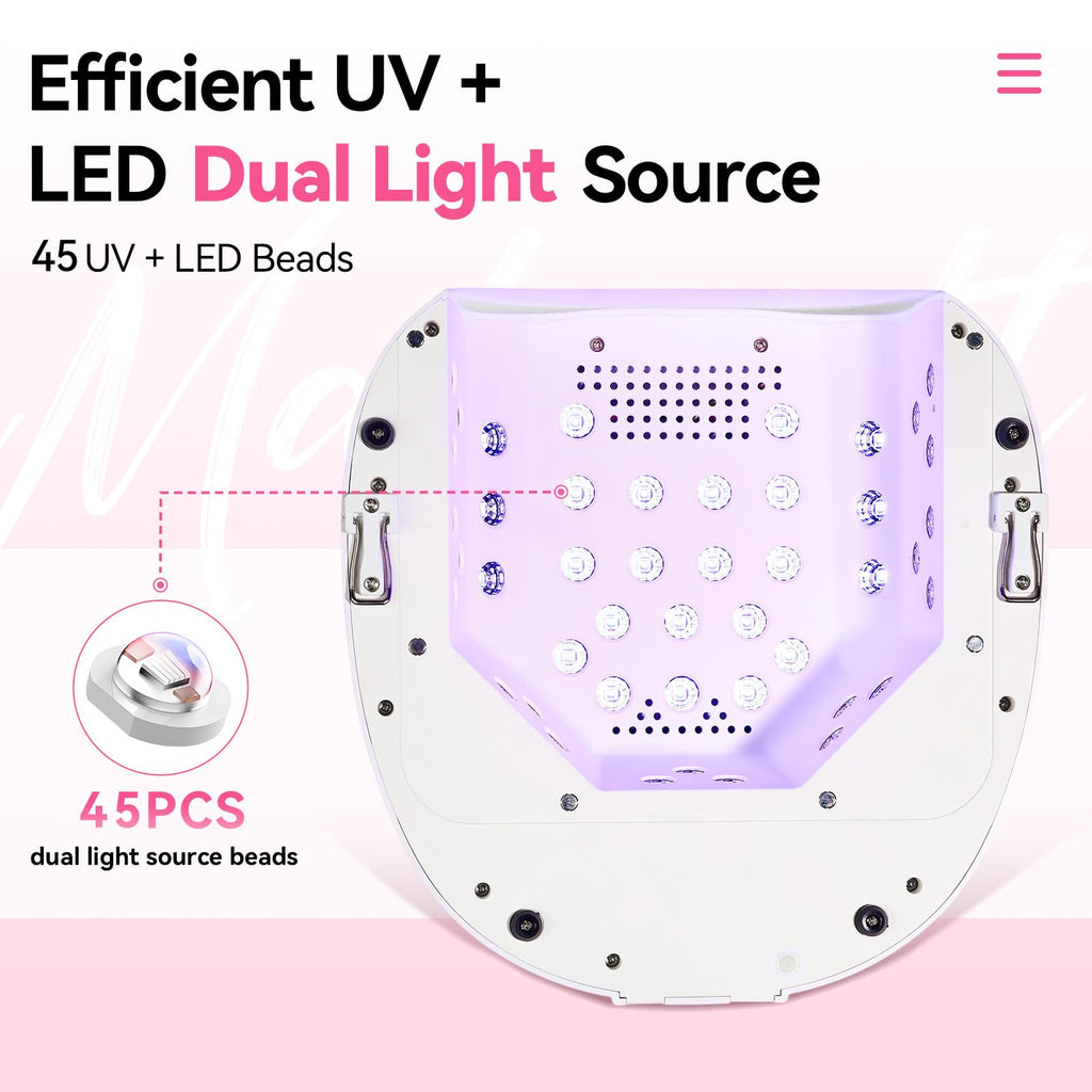 - Fast & Even Curing with Dual-Wavelength Beads: This cordless UV LED nail lamp features 45 dual-light source beads (365nm + 395nm) for fast, even curing on all gel types—base coat, top coat, builder gel, poly gel, and rhinestone glue. Whether you're using gel polish or doing Gel X nail extensions, the 15s quick cure mode cuts curing time significantly—ideal for home or salon use.