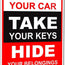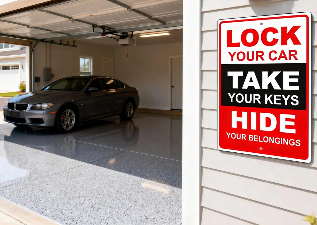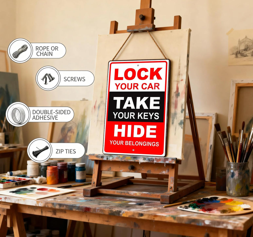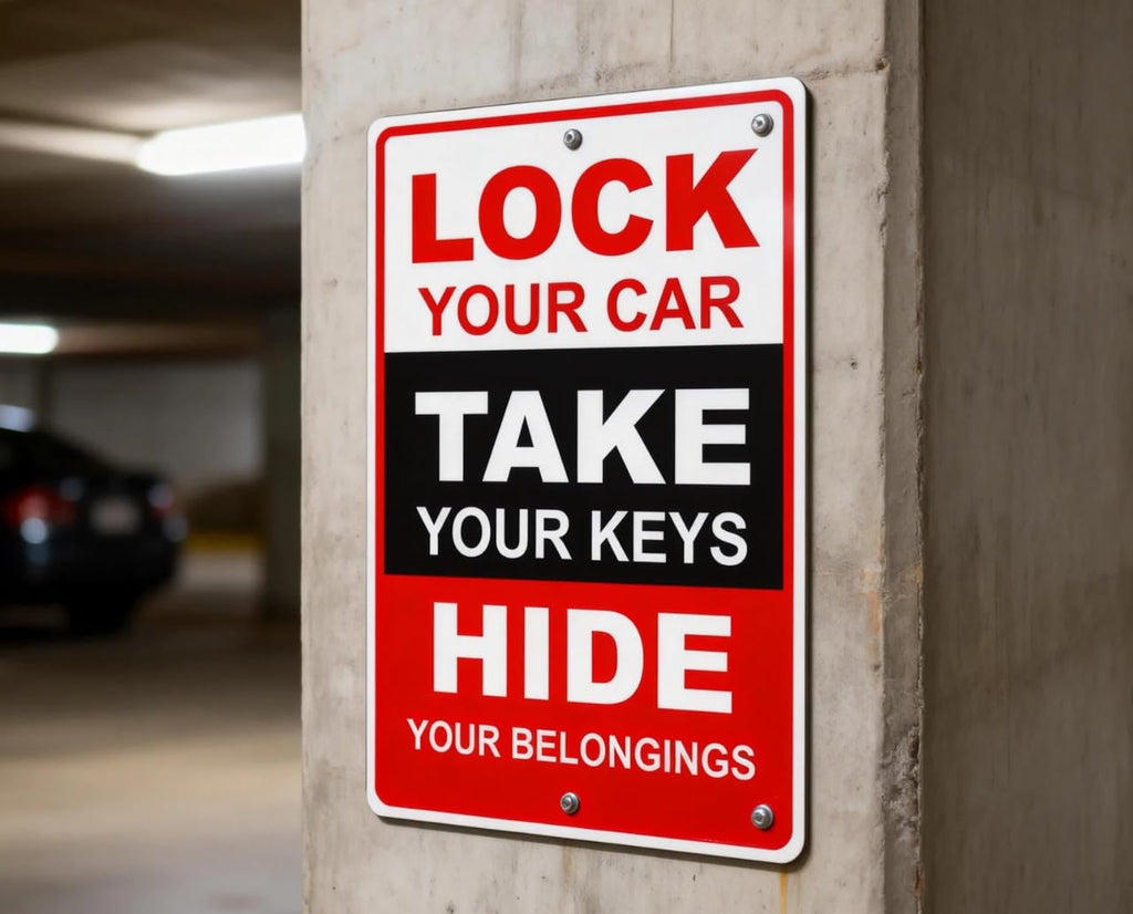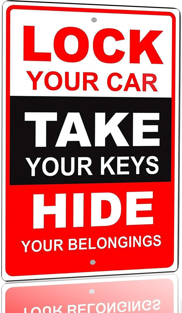 - Parking Lot & Vehicle Security Reminder This metal warning sign delivers a clear message to help prevent vehicle theft. Ideal for parking lots, garages, driveways, and shared parking areas as a parking security sign and vehicle safety reminder.
