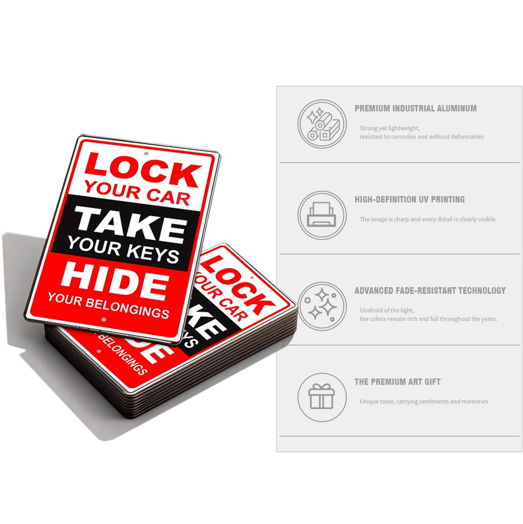 Details: Lock Your Car Take Your Keys Tin Sign – Vintage Parking Safety Wall Decor, Metal Warning Sign for Garage, Driveway, Workshop or Man Cave 8x12 Inches