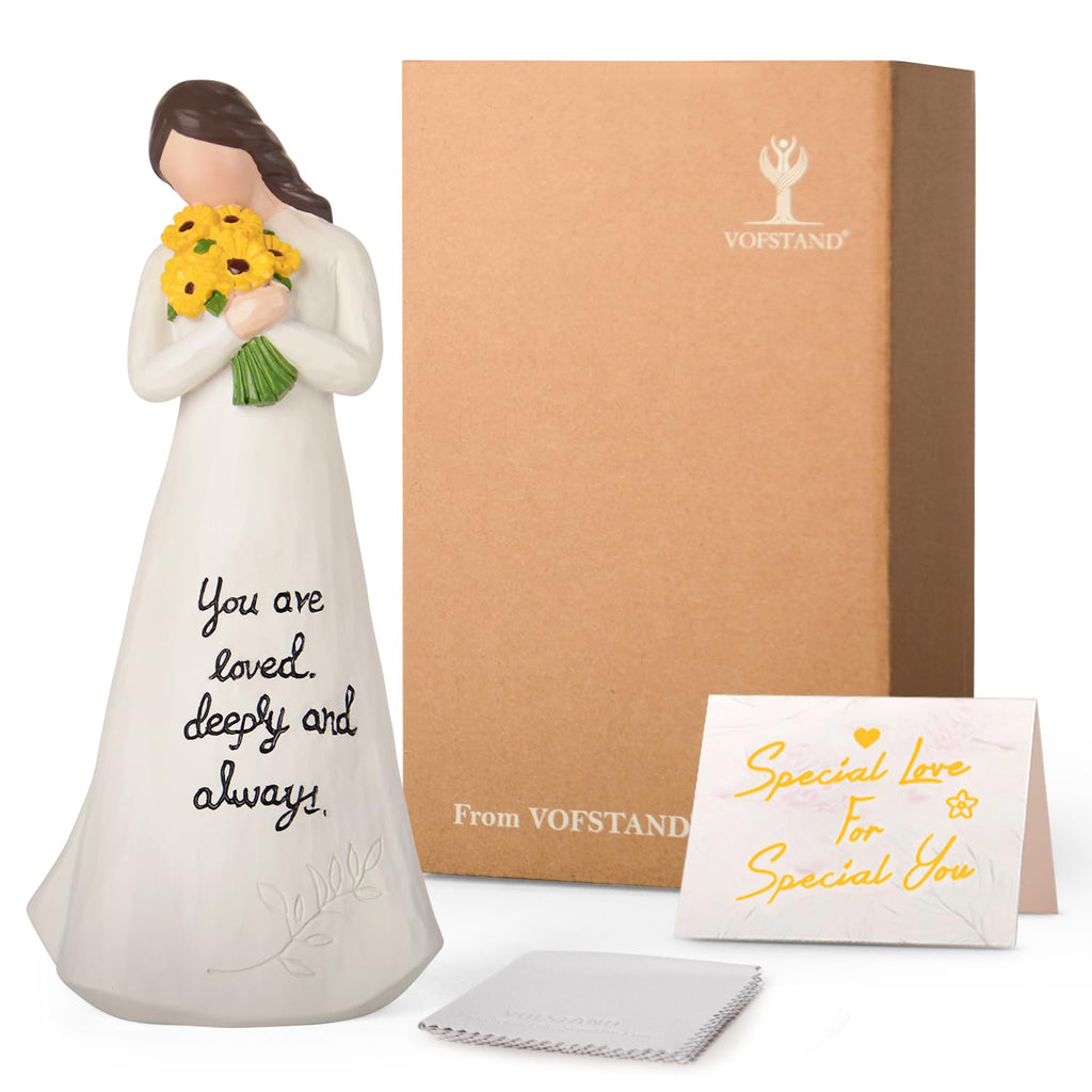 • Sunflower Gifts for Women: VOFSTAND healing gifts for woman holding sunflowers figurines is ready for gifting. Comes with Beautiful Gift Box and well package for protection and gift-giving. Whether for a mother, wife, daughter,friend or sister, it’s a sentimental gift that will touch the heart and add a personal touch to any home decor. Whether you’re celebrating Christmas, a birthday, or simply want to show someone you care, this figurine is a thoughtful and meaningful gift.