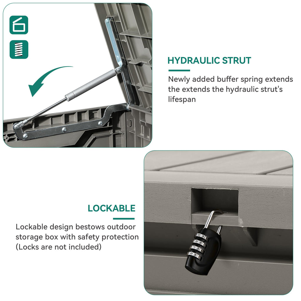 - User-Friendly Design: These outdoor deck boxes are equipped with hydraulic struts for smooth and safe operation, as well as dual built-in side handles, making it easy to move around as needed