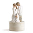 - 7”h hand-painted resin musical figure of couple seated across from each other, touching heads and hands. Man in cream shirt and dark pants; woman in cream dress with full skirt. Figure affixed to round, cream wood base, carved with filigree of hearts, containing musical element.