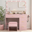 Details: Create your own beauty corner in the dressing room, or a cozy studio. This vanity desk blends well with modern, minimalist, or soft glam styles. You get a wide LED mirror with 3 light tones, a sturdy wood frame, a soft cushioned stool, 4 spacious drawers for all your go-to essentials, a built-in hairdryer rack, plus 2 USB ports and 2 outlets that keep everything charged and ready. Getting ready feels smooth, organized, and a little bit luxurious.Specifications: Color: Pink Material: Engineered Wood, Metal Desk' Size: 15.74"D x 35.43"W x 53.54"H Stool' Size: 15.6"D x 10.2"W x 16.7"H Net Product Weight: 93.7 lbs Assembly required: yes, instructions included