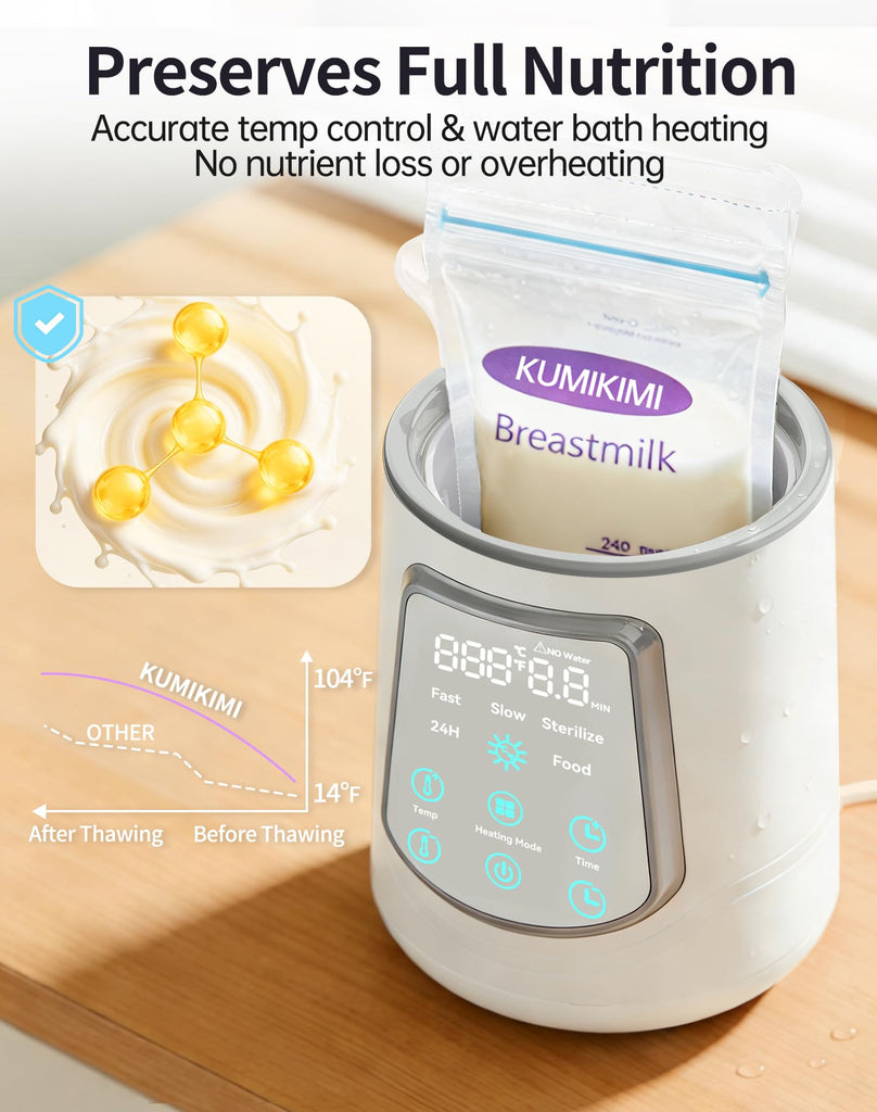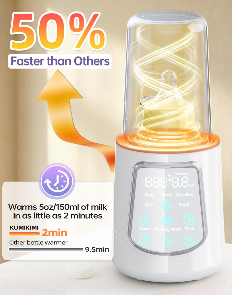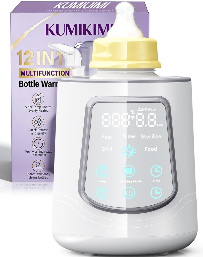 - Upgraded Smart 12-in-1 Bottle Warmer:The KUMIKIMI warmer combines fast warming, defrosting,normal heating,24H keep-warm,steaming,food warming,adjustable timer, temperature,anti-scald tray,water alert,auto-shut off,and memory function for all your needs
