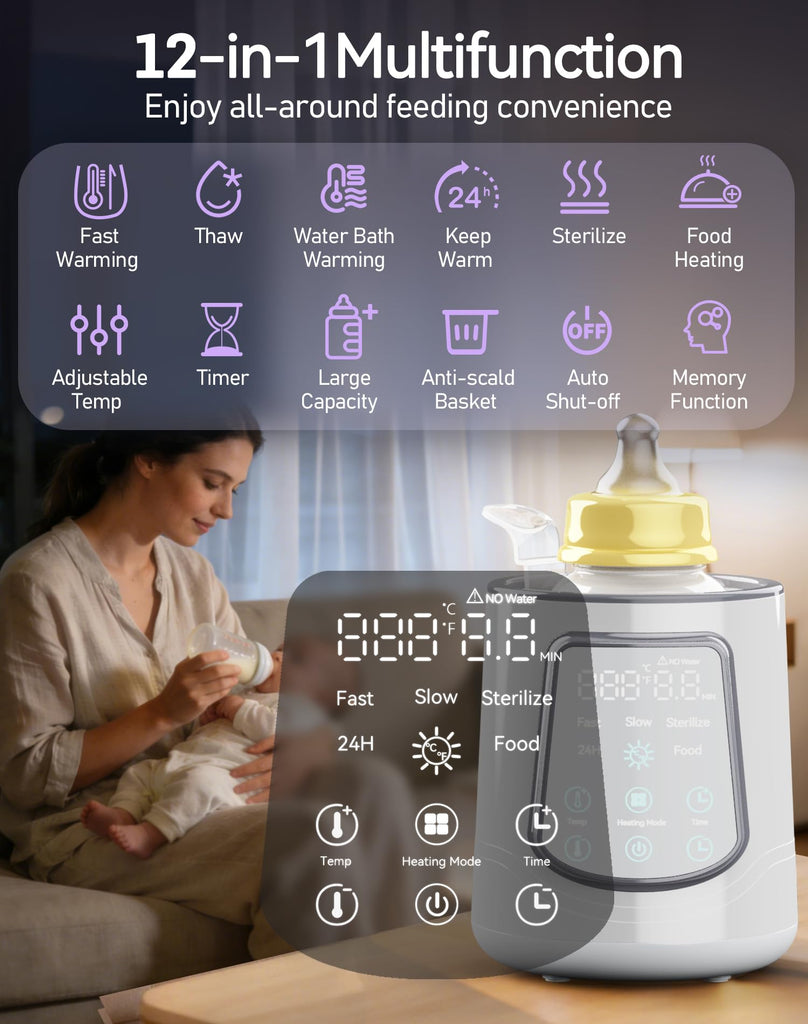 - Customizable Temp and Time:Precisely set your preferred temperature for warming milk,sterilizing,or heating baby food and maintain it for up to 24 hours.An great gift for new and busy parents,practical for precise,easy baby care